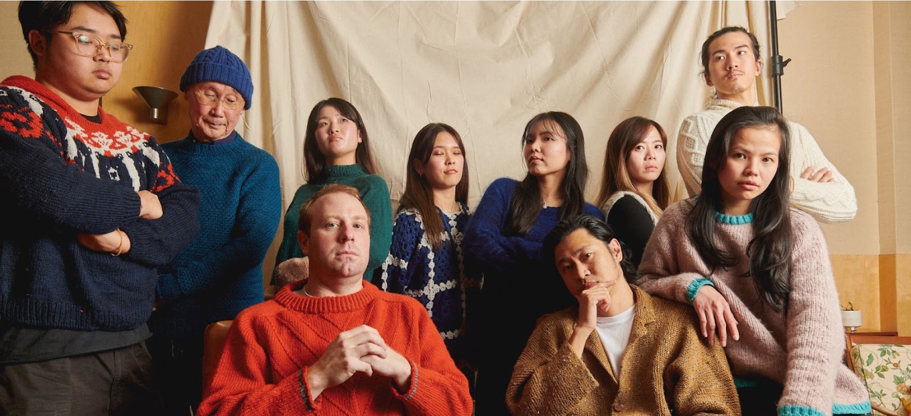 Min does not just casually knit, he’s a serious knitter. See the photo below of the Tokyo Lamington family photoshoot. He knitted all (yes, all) of these items for his team for Christmas. When I ask him about his knitting style and the inspiration behind the photo, he says “think Schitt’s Creek crossed with Succession”.