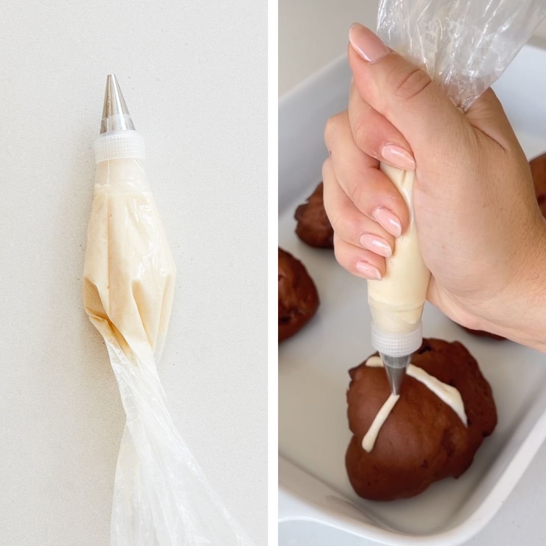 Spoon into a snap-lock bag. Snip 1 corner from bag. Pipe crosses onto buns.